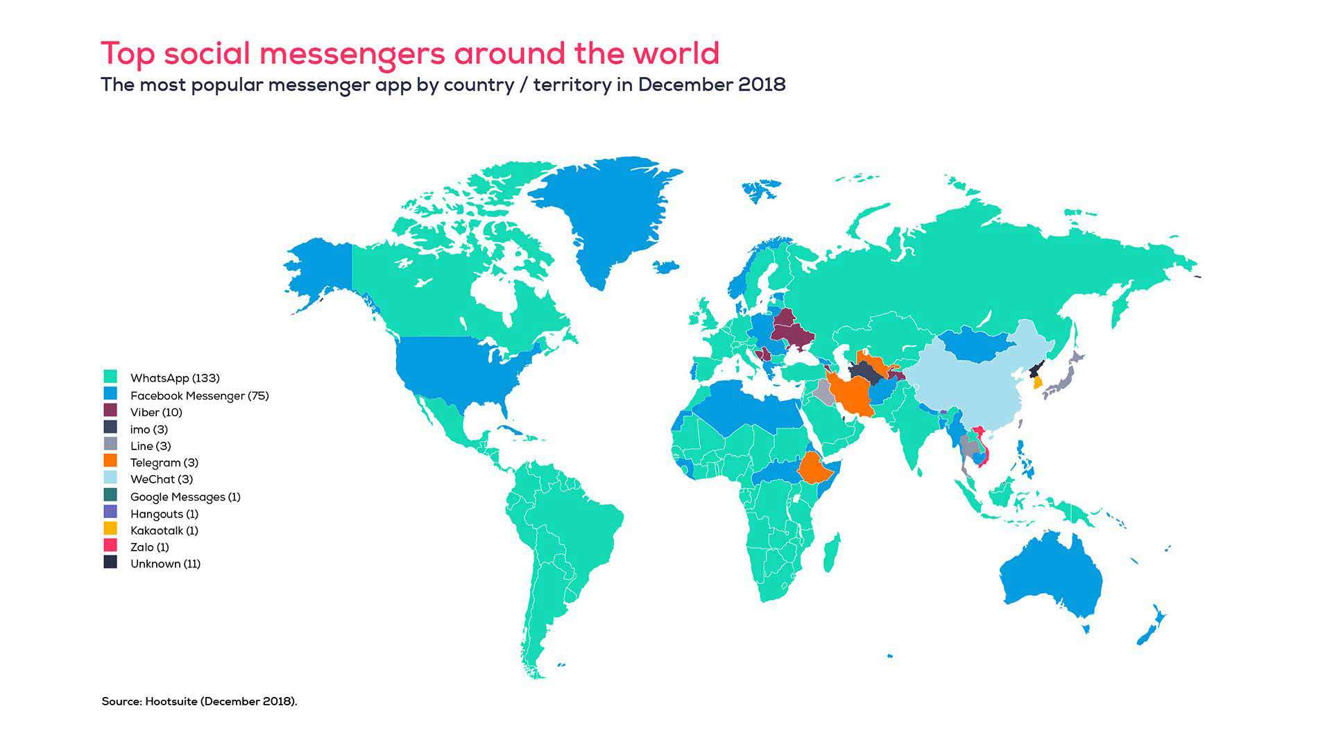 Find below a mapping of the popularity of different messaging applications around the world: